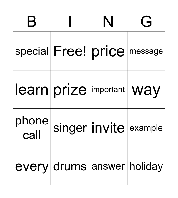 This bingo card has 32 words: Awesome, choose, example, guest, holiday, important, learn, listen to, Free!, practice, way, price, young, by car, drums, gig, guitar, invite, month, pick up, musical instrument, remember, answer, competition, every, message, phone call, prize, special, winner, text message and singer.