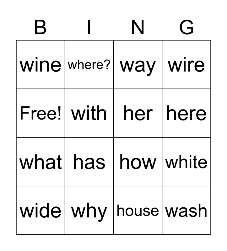 This bingo card has 16 words: why, white, way, wine, what, where?, how, house, Free!, with, wide, wire, has, here, her and wash.