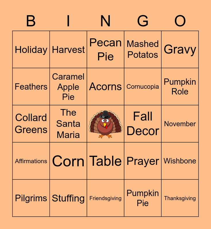 This bingo card has a free space and 44 words: Turkey, Thanksgiving, Ham, Pilgrims, Sweet Potato Pie, Pumpkin Pie, Pecan Pie, Cranberry Sauce, Gravy, Stuffing, Mashed Potatos, Fall Decor, Table, Corn, Family, Friendsgiving, Green Bean Casserole, Collard Greens, Cornbread, Pumpkin Role, Harvest, Macy's Parade, Travel, Holiday, Laughter, November, Memories, Gratitutde, Prayer, Affirmations, Football, Wishbone, The Nina, The Pinta, The Santa Maria, Overeating, Food Coma, Pot Luck, Acorns, Feathers, Cornucopia, Gobble Gobble, Caramel Apple Pie and Black Friday.