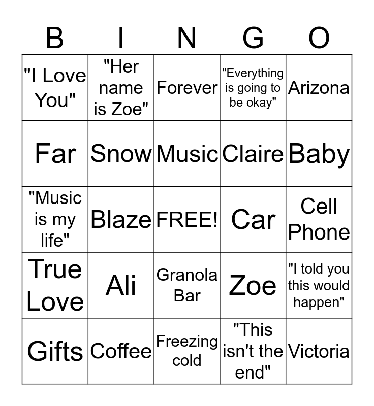 This bingo card has a free space and 24 words: Ali, Coffee, Music, Gifts, Arizona, "I Love You", Far, "Her name is Zoe", Car, Granola Bar, Claire, "Music is my life", Zoe, "I told you this would happen", Snow, "This isn't the end", Cell Phone, Forever, Baby, Blaze, Victoria, True Love, "Everything is going to be okay" and Freezing cold.