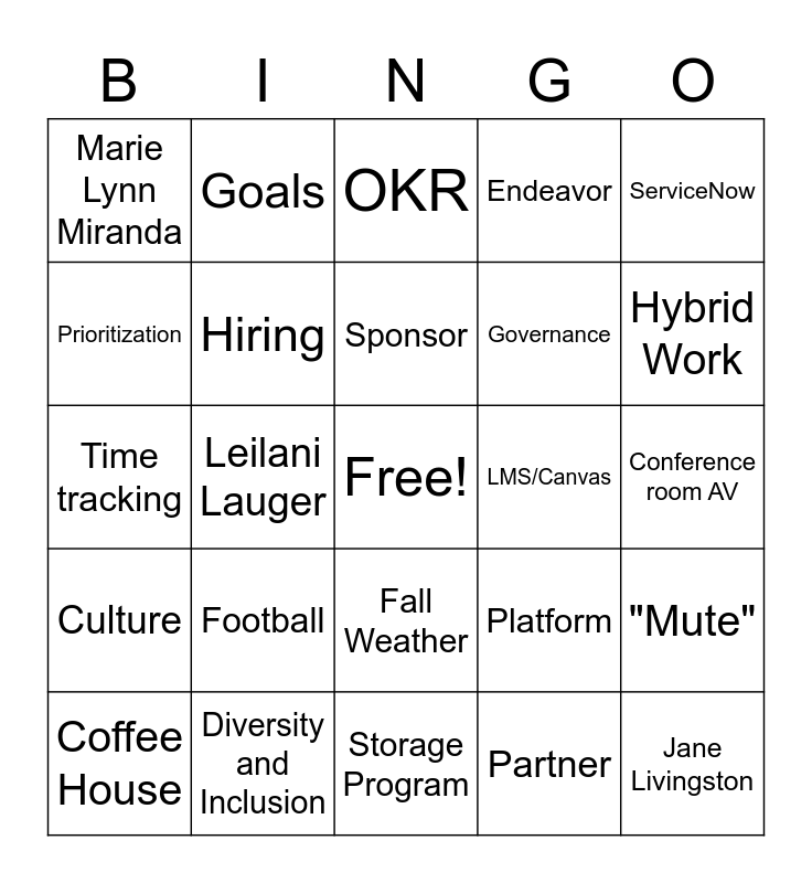 This bingo card has a free space and 28 words: "Mute", Tells host to advance slide, Governance, Partner, Prioritization, OKR, Goals, Culture, LMS/Canvas, Coffee House, Time tracking, Endeavor, Diversity and Inclusion, Storage Program, Hybrid Work, Vacation, Football, Hiring, Sponsor, Fall Weather, Marie Lynn Miranda, Shannon Cullinan, Jane Livingston, Leilani Lauger, Conference room AV, Platform, ServiceNow and Christmas.
