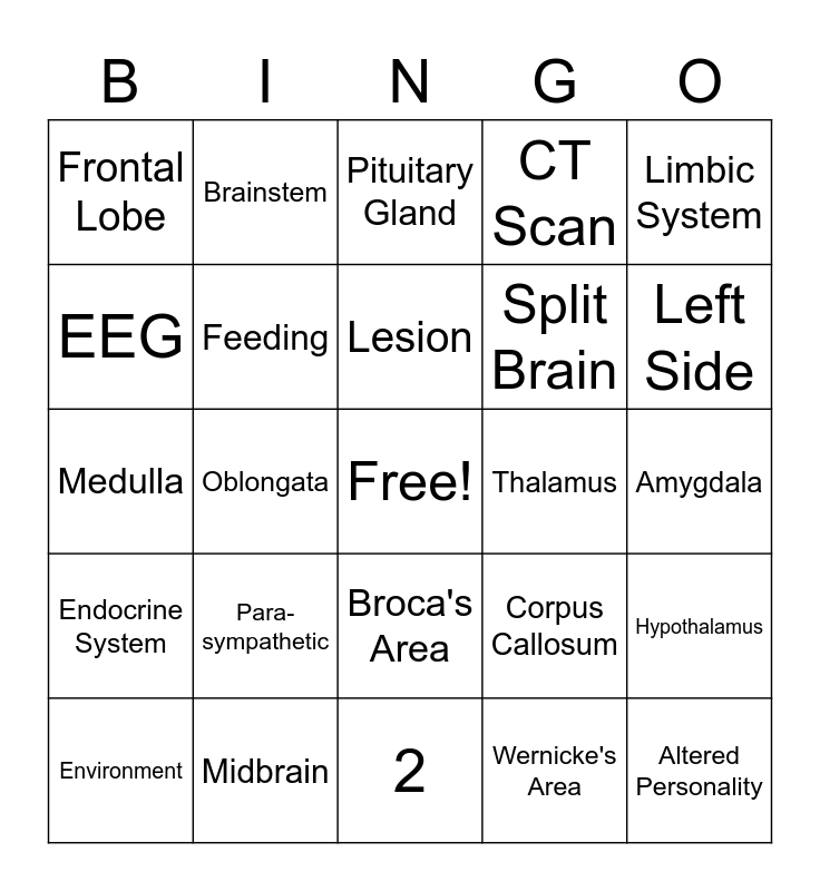 This bingo card has a free space and 24 words: Para-sympathetic, Midbrain, Lesion, Environment, Limbic System, Frontal Lobe, EEG, Brainstem, Thalamus, Broca's Area, Split Brain, Medulla, Corpus Callosum, Hypothalamus, Feeding, Wernicke's Area, Amygdala, Pituitary Gland, Left Side, Oblongata, Altered Personality, Endocrine System, CT Scan and 2.