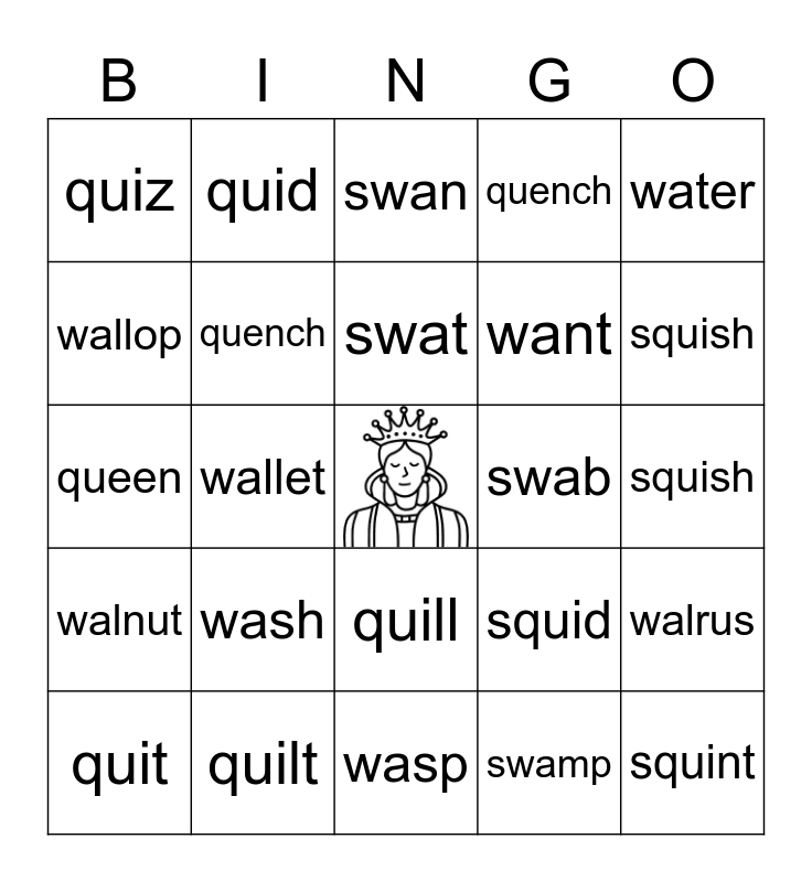 This bingo card has a free space and 24 words: wash, quilt, swat, quit, water, quiz, wallop, quid, swab, quill, want, queen, squid, walrus, quench, swamp, squish, swan, squish, wallet, squint, walnut, quench and wasp.