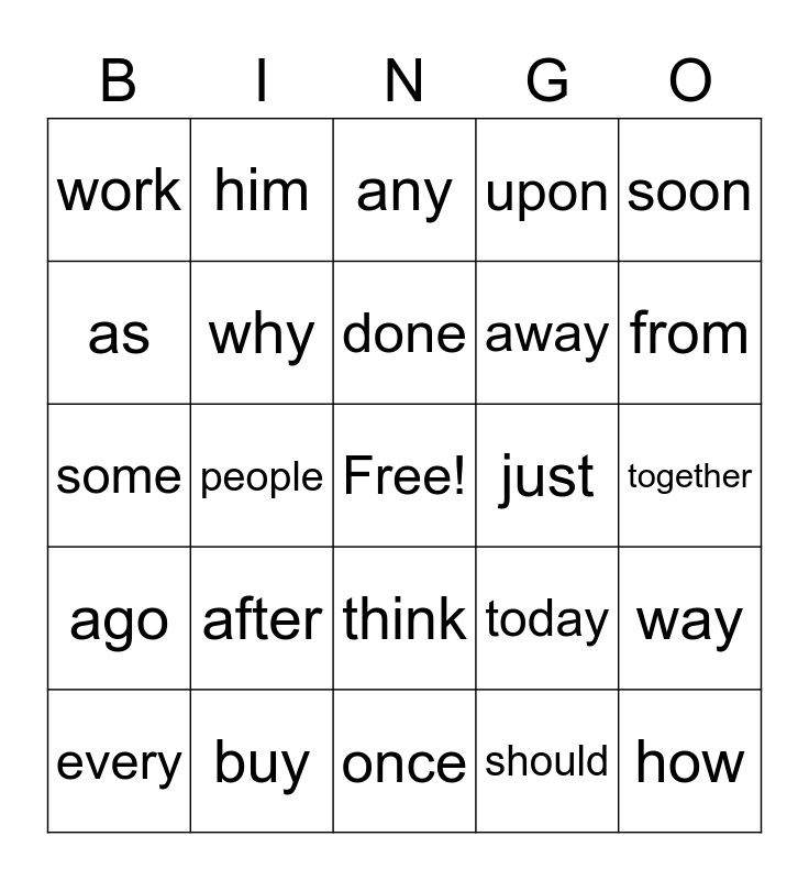 This bingo card has a free space and 24 words: after, buy, done, every, soon, work, as, him, just, think, away, some, today, way, why, should, together, any, from, people, how, ago, upon and once.