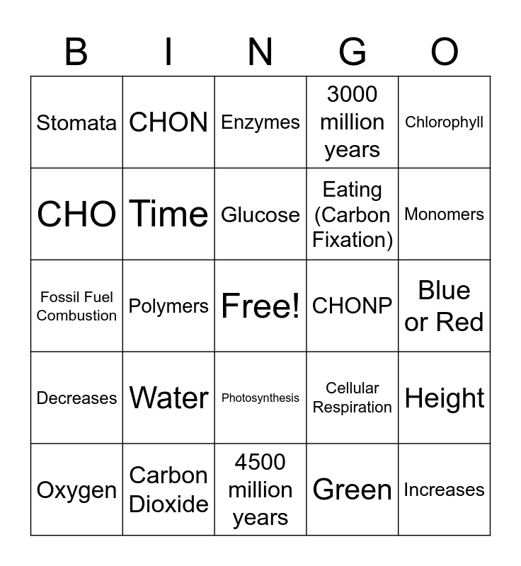 This bingo card has a free space and 24 words: Water, Carbon Dioxide, Glucose, Oxygen, Chlorophyll, Stomata, CHO, CHON, CHONP, Photosynthesis, Eating (Carbon Fixation), Fossil Fuel Combustion, Cellular Respiration, Height, Time, Green, Blue or Red, Enzymes, Monomers, Polymers, Increases, Decreases, 3000 million years and 4500 million years.
