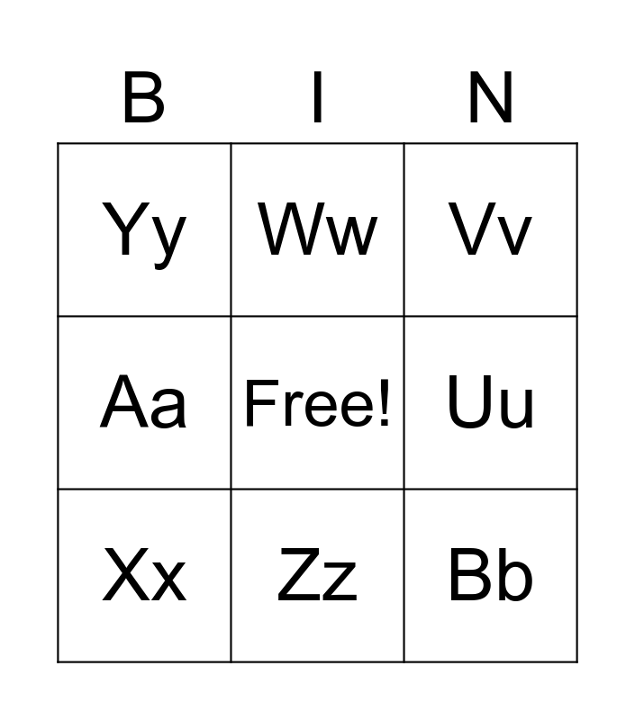 This bingo card has a free space and 8 words: Uu, Vv, Ww, Xx, Yy, Bb, Aa and Zz.