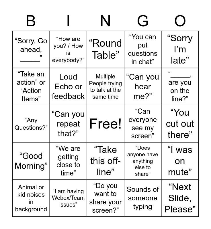 This bingo card has a free space and 26 words: “Take this off-line”, Sounds of someone typing, Multiple People trying to talk at the same time, “I am having Webex/Team issues”, “Sorry I’m late”, “Sorry, Go ahead, _____”, “Take an action” or “Action Items”, “How are you? / How is everybody?”, “You cut out there”, “Does anyone have anything else to share”, “Can you hear me?”, “Any Questions?”, “I was on mute”, Animal or kid noises in background, “Can you repeat that?”, “____ can you go on mute?”, “You can put questions in chat”, “Good Morning”, “Round Table”, “Next Slide, Please”, “_____, are you on the line?”, “Do you want to share your screen?”, “Can everyone see my screen”, “We are getting close to time”, Loud Echo or feedback and “Good Point” or “Great Point”.