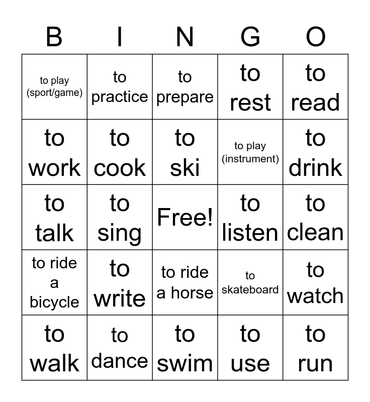 This bingo card has a free space and 31 words: to swim, to eat, to sing, to rent, to play (sport/game), to prepare, to cook, to skateboard, to listen, to use, to clean, to run, to draw, to buy, to drink, to buy, to watch, to write, to ride a bicycle, to ride a horse, to read, to learn, to walk, to practice, to play (instrument), to work, to rest, to talk, to dance, to ski and to hang out.