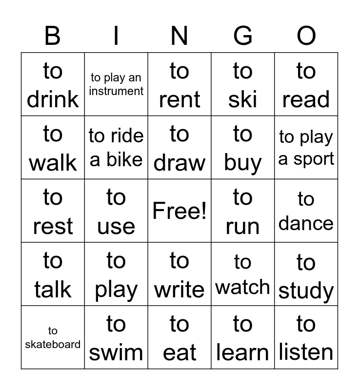 This bingo card has a free space and 24 words: to play, to swim, to draw, to skateboard, to read, to drink, to walk, to play an instrument, to run, to write, to buy, to rest, to watch, to study, to ride a bike, to learn, to dance, to rent, to play a sport, to use, to listen, to talk, to ski and to eat.