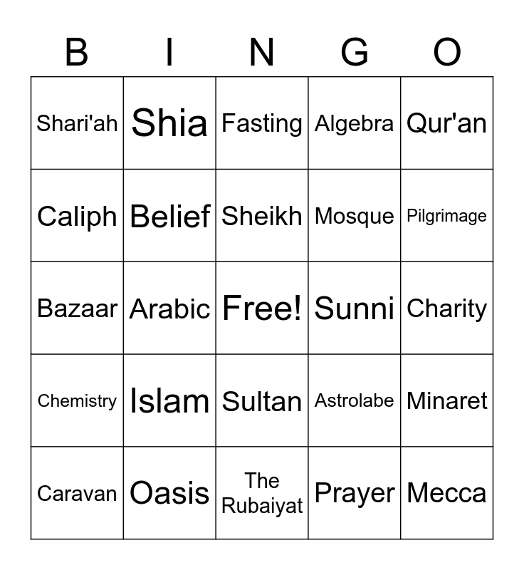 This bingo card has a free space and 24 words: Islam, Oasis, Sheikh, Caravan, Qur'an, Shari'ah, Caliph, Shia, Sunni, Sultan, Mosque, Bazaar, Astrolabe, Minaret, Belief, Prayer, Charity, Fasting, Pilgrimage, Arabic, Mecca, Chemistry, Algebra and The Rubaiyat.