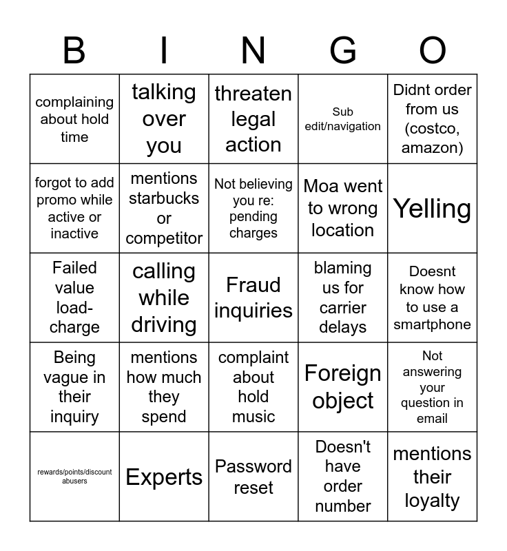 This bingo card has 29 words: rewards/points/discount abusers, overreacting to marketing communications, calling while driving, mentions their loyalty, complaining about hold time, threaten legal action, mentions starbucks or competitor, mentions how much they spend, blaming us for carrier delays, Experts, Doesnt know how to use a smartphone, Fraud inquiries, Password reset, Doesn't have order number, Yelling, calling us by the wrong name, complaint about hold music, Being vague in their inquiry, Didnt order from us (costco, amazon), Failed value load-charge, Foreign object, long wait time for MOA, Moa went to wrong location, forgot to add promo while active or inactive, Sub edit/navigation, talking over you, Not answering your question in email, Not believing you re: pending charges and their reality is truth.