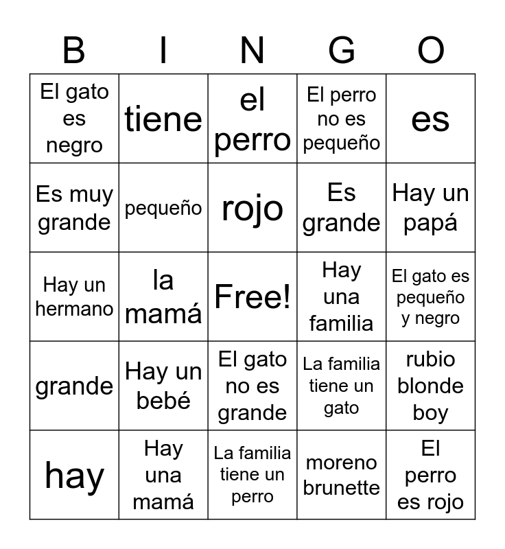 This bingo card has a free space and 33 words: la familia, el papá, la mamá, el hermano, grande, pequeño, es, hay, tiene, negro, rojo, el perro, el gato, la hermana, Hay una familia, Hay un papá, Hay una mamá, Hay un hermano, Hay un bebé, La familia tiene un gato, El gato no es grande, El gato es pequeño, El gato es negro, El gato es pequeño y negro, La familia tiene un perro, El perro es rojo, El perro no es pequeño, Es grande, Es muy grande, rubio blonde boy, rubia blonde girl, moreno brunette and pelirojo readhead.