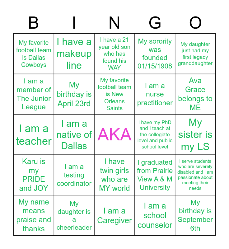 This bingo card has a free space and 24 words: I am a testing coordinator, My daughter is a cheerleader, My favorite football team is New Orleans Saints, My name means praise and thanks, My daughter just had my first legacy granddaughter, My favorite football team is Dallas Cowboys, I am a member of The Junior League, I have a makeup line, I have my PhD and I teach at the collegiate level and public school level, I have twin girls who are MY world, I am a nurse practitioner, I am a teacher, I graduated from Prairie View A & M University, I serve students who are severely disabled and I am passionate about meeting their needs, My birthday is April 23rd, I am a school counselor, My sister is my LS, I have a 21 year old son who has found his WAY, Ava Grace belongs to ME, I am a native of Dallas, My birthday is September 6th, Karu is my PRIDE and JOY, My sorority was founded 01/15/1908 and I am a Caregiver.