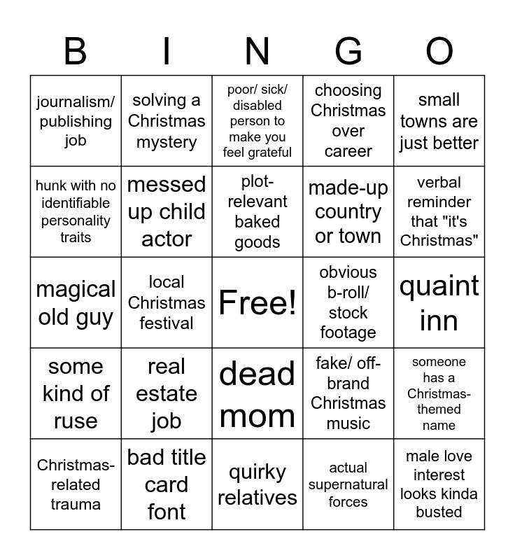 This bingo card has a free space and 24 words: real estate job, bad title card font, plot-relevant baked goods, Christmas-related trauma, small towns are just better, journalism/ publishing job, hunk with no identifiable personality traits, solving a Christmas mystery, obvious b-roll/ stock footage, dead mom, made-up country or town, magical old guy, fake/ off-brand Christmas music, someone has a Christmas-themed name, messed up child actor, actual supernatural forces, quaint inn, poor/ sick/ disabled person to make you feel grateful, verbal reminder that "it's Christmas", local Christmas festival, male love interest looks kinda busted, some kind of ruse, choosing Christmas over career and quirky relatives.