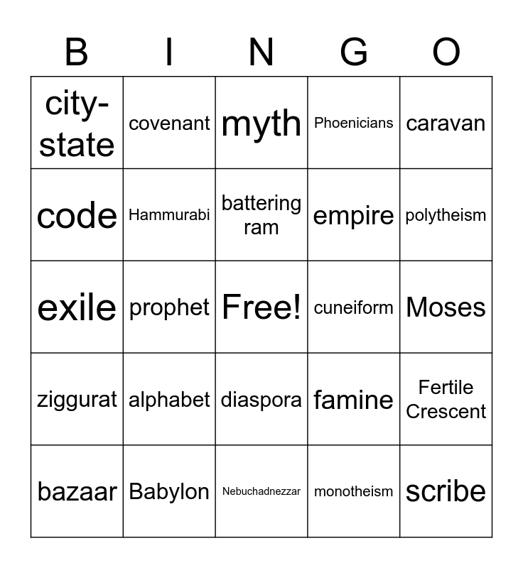 This bingo card has a free space and 24 words: alphabet, Babylon, battering ram, bazaar, caravan, city-state, code, covenant, cuneiform, diaspora, empire, exile, famine, Fertile Crescent, Hammurabi, monotheism, Moses, myth, polytheism, prophet, scribe, ziggurat, Phoenicians and Nebuchadnezzar.