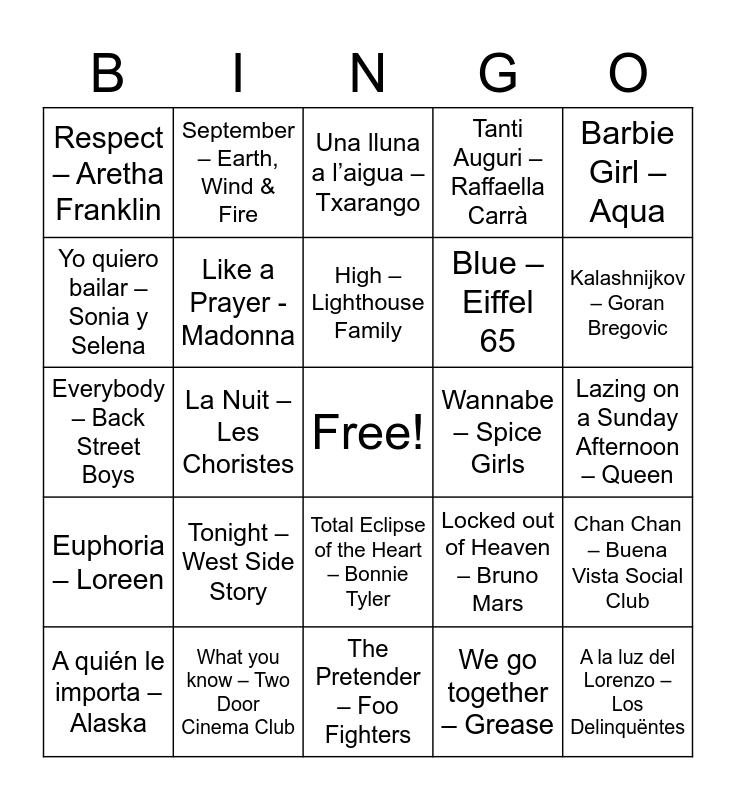 This bingo card has a free space and 25 words: Tonight – West Side Story, The Pretender – Foo Fighters, High – Lighthouse Family, A quién le importa – Alaska, Barbie Girl – Aqua, Respect – Aretha Franklin, Yo quiero bailar – Sonia y Selena, September – Earth, Wind & Fire, Wannabe – Spice Girls, Total Eclipse of the Heart – Bonnie Tyler, Blue – Eiffel 65, Everybody – Back Street Boys, Locked out of Heaven – Bruno Mars, Chan Chan – Buena Vista Social Club, Like a Prayer - Madonna, La vida es un Carnaval – Celia Cruz, Lazing on a Sunday Afternoon – Queen, Una lluna a l’aigua – Txarango, Kalashnijkov – Goran Bregovic, La Nuit – Les Choristes, A la luz del Lorenzo – Los Delinquëntes, What you know – Two Door Cinema Club, Euphoria – Loreen, Tanti Auguri – Raffaella Carrà and We go together – Grease.