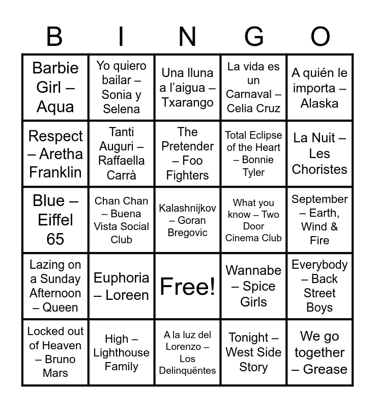 This bingo card has 26 words: Free!, Tonight – West Side Story, The Pretender – Foo Fighters, High – Lighthouse Family, A quién le importa – Alaska, Barbie Girl – Aqua, Respect – Aretha Franklin, Yo quiero bailar – Sonia y Selena, September – Earth, Wind & Fire, Wannabe – Spice Girls, Total Eclipse of the Heart – Bonnie Tyler, Blue – Eiffel 65, Everybody – Back Street Boys, Locked out of Heaven – Bruno Mars, Chan Chan – Buena Vista Social Club, Like a Prayer - Madonna, La vida es un Carnaval – Celia Cruz, Lazing on a Sunday Afternoon – Queen, Una lluna a l’aigua – Txarango, Kalashnijkov – Goran Bregovic, La Nuit – Les Choristes, A la luz del Lorenzo – Los Delinquëntes, What you know – Two Door Cinema Club, Euphoria – Loreen, Tanti Auguri – Raffaella Carrà and We go together – Grease.