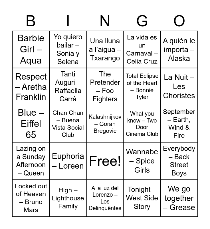 This bingo card has 26 words: Free!, Tonight – West Side Story, The Pretender – Foo Fighters, High – Lighthouse Family, A quién le importa – Alaska, Barbie Girl – Aqua, Respect – Aretha Franklin, Yo quiero bailar – Sonia y Selena, September – Earth, Wind & Fire, Wannabe – Spice Girls, Total Eclipse of the Heart – Bonnie Tyler, Blue – Eiffel 65, Everybody – Back Street Boys, Locked out of Heaven – Bruno Mars, Chan Chan – Buena Vista Social Club, Like a Prayer - Madonna, La vida es un Carnaval – Celia Cruz, Lazing on a Sunday Afternoon – Queen, Una lluna a l’aigua – Txarango, Kalashnijkov – Goran Bregovic, La Nuit – Les Choristes, A la luz del Lorenzo – Los Delinquëntes, What you know – Two Door Cinema Club, Euphoria – Loreen, Tanti Auguri – Raffaella Carrà and We go together – Grease.