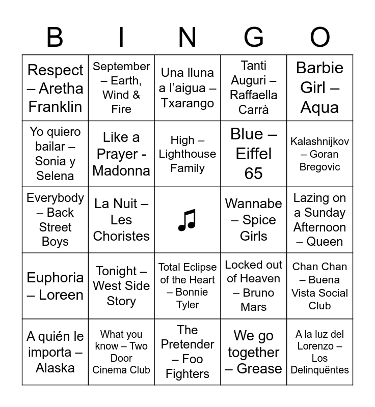 This bingo card has a free space and 25 words: Tonight – West Side Story, The Pretender – Foo Fighters, High – Lighthouse Family, A quién le importa – Alaska, Barbie Girl – Aqua, Respect – Aretha Franklin, Yo quiero bailar – Sonia y Selena, September – Earth, Wind & Fire, Wannabe – Spice Girls, Total Eclipse of the Heart – Bonnie Tyler, Blue – Eiffel 65, Everybody – Back Street Boys, Locked out of Heaven – Bruno Mars, Chan Chan – Buena Vista Social Club, Like a Prayer - Madonna, La vida es un Carnaval – Celia Cruz, Lazing on a Sunday Afternoon – Queen, Una lluna a l’aigua – Txarango, Kalashnijkov – Goran Bregovic, La Nuit – Les Choristes, A la luz del Lorenzo – Los Delinquëntes, What you know – Two Door Cinema Club, Euphoria – Loreen, Tanti Auguri – Raffaella Carrà and We go together – Grease.
