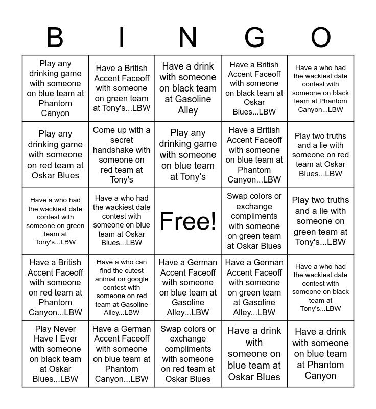 This bingo card has a free space and 180 words: Have a drink with someone on red team at Tony's, Play two truths and a lie with someone on red team at Tony's...LBW, Play truth or truth with someone on red team at Tony's, Play any drinking game with someone on red team at Tony's, Come up with a secret handshake with someone on red team at Tony's, Swap colors or exchange compliments with someone on red team at Tony's, Have a who can find the cutest animal on google contest with someone on red team at Tony's...LBW, Play Never Have I Ever with someone on red team at Tony's...LBW, Have a who had the wackiest date contest with someone on red team at Tony's...LBW, Have a British Accent Faceoff with someone on red team at Tony's...LBW, Have a German Accent Faceoff with someone on red team at Tony's...LBW, Have a drink with someone on red team at Oskar Blues, Play two truths and a lie with someone on red team at Oskar Blues...LBW, Play truth or truth with someone on red team at Oskar Blues, Play any drinking game with someone on red team at Oskar Blues, Come up with a secret handshake with someone on red team at Oskar Blues, Swap colors or exchange compliments with someone on red team at Oskar Blues, Have a who can find the cutest animal on google contest with someone on red team at Oskar Blues...LBW, Play Never Have I Ever with someone on red team at Oskar Blues...LBW, Have a who had the wackiest date contest with someone on red team at Oskar Blues...LBW, Have a British Accent Faceoff with someone on red team at Oskar Blues...LBW, Have a German Accent Faceoff with someone on red team at Oskar Blues...LBW, Have a drink with someone on red team at Gasoline Alley, Play two truths and a lie with someone on red team at Gasoline Alley...LBW, Play truth or truth with someone on red team at Gasoline Alley, Play any drinking game with someone on red team at Gasoline Alley, Come up with a secret handshake with someone on red team at Gasoline Alley, Swap colors or exchange compliments with someone on red team at Gasoline Alley, Have a who can find the cutest animal on google contest with someone on red team at Gasoline Alley...LBW, Play Never Have I Ever with someone on red team at Gasoline Alley...LBW, Have a who had the wackiest date contest with someone on red team at Gasoline Alley...LBW, Have a British Accent Faceoff with someone on red team at Gasoline Alley...LBW, Have a German Accent Faceoff with someone on red team at Gasoline Alley...LBW, Have a drink with someone on red team at Phantom Canyon, Play two truths and a lie with someone on red team at Phantom Canyon...LBW, Play truth or truth with someone on red team at Phantom Canyon, Play any drinking game with someone on red team at Phantom Canyon, Come up with a secret handshake with someone on red team at Phantom Canyon, Swap colors or exchange compliments with someone on red team at Phantom Canyon, Have a who can find the cutest animal on google contest with someone on red team at Phantom Canyon...LBW, Play Never Have I Ever with someone on red team at Phantom Canyon...LBW, Have a who had the wackiest date contest with someone on red team at Phantom Canyon...LBW, Have a British Accent Faceoff with someone on red team at Phantom Canyon...LBW, Have a German Accent Faceoff with someone on red team at Phantom Canyon...LBW, Have a drink with someone on green team at Tony's, Play two truths and a lie with someone on green team at Tony's...LBW, Play truth or truth with someone on green team at Tony's, Play any drinking game with someone on green team at Tony's, Come up with a secret handshake with someone on green team at Tony's, Swap colors or exchange compliments with someone on green team at Tony's, Have a who can find the cutest animal on google contest with someone on green team at Tony's...LBW, Play Never Have I Ever with someone on green team at Tony's...LBW, Have a who had the wackiest date contest with someone on green team at Tony's...LBW, Have a British Accent Faceoff with someone on green team at Tony's...LBW, Have a German Accent Faceoff with someone on green team at Tony's...LBW, Have a drink with someone on green team at Oskar Blues, Play two truths and a lie with someone on green team at Oskar Blues...LBW, Play truth or truth with someone on green team at Oskar Blues, Play any drinking game with someone on green team at Oskar Blues, Come up with a secret handshake with someone on green team at Oskar Blues, Swap colors or exchange compliments with someone on green team at Oskar Blues, Have a who can find the cutest animal on google contest with someone on green team at Oskar Blues...LBW, Play Never Have I Ever with someone on green team at Oskar Blues...LBW, Have a who had the wackiest date contest with someone on green team at Oskar Blues...LBW, Have a British Accent Faceoff with someone on green team at Oskar Blues...LBW, Have a German Accent Faceoff with someone on green team at Oskar Blues...LBW, Have a drink with someone on green team at Gasoline Alley, Play two truths and a lie with someone on green team at Gasoline Alley...LBW, Play truth or truth with someone on green team at Gasoline Alley, Play any drinking game with someone on green team at Gasoline Alley, Come up with a secret handshake with someone on green team at Gasoline Alley, Swap colors or exchange compliments with someone on green team at Gasoline Alley, Have a who can find the cutest animal on google contest with someone on green team at Gasoline Alley...LBW, Play Never Have I Ever with someone on green team at Gasoline Alley...LBW, Have a who had the wackiest date contest with someone on green team at Gasoline Alley...LBW, Have a British Accent Faceoff with someone on green team at Gasoline Alley...LBW, Have a German Accent Faceoff with someone on green team at Gasoline Alley...LBW, Have a drink with someone on green team at Phantom Canyon, Play two truths and a lie with someone on green team at Phantom Canyon...LBW, Play truth or truth with someone on green team a