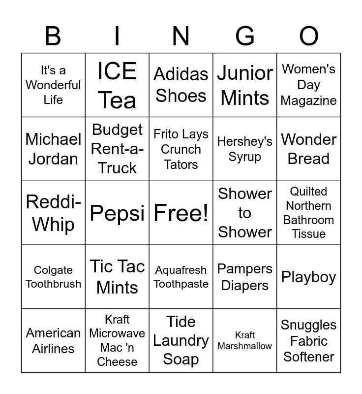 This bingo card has a free space and 25 words: Tic Tac Mints, Tide Laundry Soap, Frito Lays Crunch Tators, American Airlines, Women's Day Magazine, It's a Wonderful Life, Michael Jordan, ICE Tea, Shower to Shower, Aquafresh Toothpaste, Hershey's Syrup, Reddi-Whip, Pampers Diapers, Playboy, Budget Rent-a-Truck, Tropicana Orange Juice, Quilted Northern Bathroom Tissue, Adidas Shoes, Wonder Bread, Pepsi, Snuggles Fabric Softener, Kraft Microwave Mac 'n Cheese, Colgate Toothbrush, Junior Mints and Kraft Marshmallow.