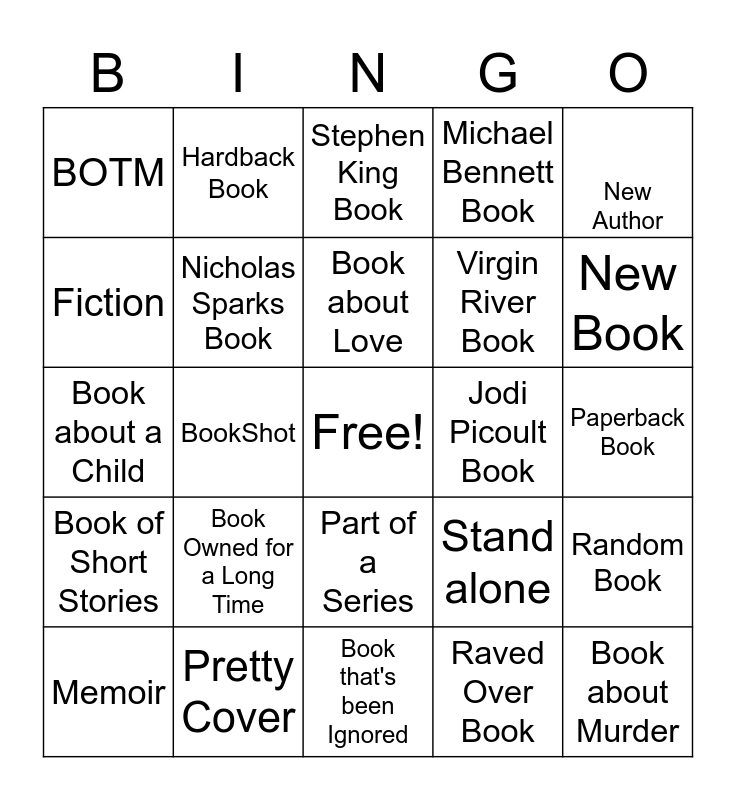This bingo card has a free space and 24 words: Book Owned for a Long Time, Pretty Cover, Book about Love, Memoir, New Author, BOTM, Fiction, Hardback Book, Jodi Picoult Book, Part of a Series, Virgin River Book, Book about a Child, Stand alone, Random Book, Nicholas Sparks Book, Raved Over Book, Paperback Book, Stephen King Book, New Book, BookShot, Book about Murder, Book of Short Stories, Michael Bennett Book and Book that's been Ignored.