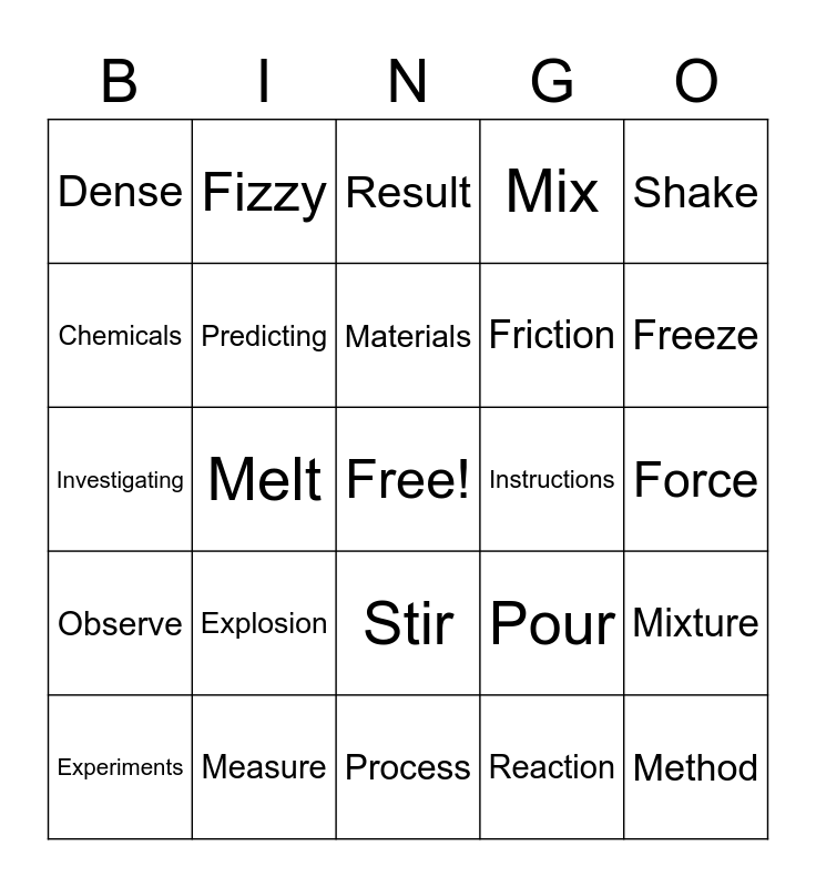 This bingo card has a free space and 24 words: Explosion, Measure, Materials, Experiments, Shake, Dense, Chemicals, Fizzy, Instructions, Stir, Friction, Investigating, Pour, Mixture, Predicting, Reaction, Force, Result, Freeze, Melt, Method, Observe, Mix and Process.