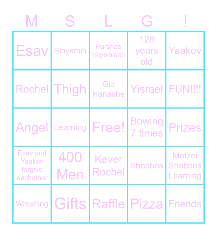 This bingo card has a free space and 24 words: 400 Men, Gifts, Gid Hanashe, Wrestling, Yaakov, Esav, Rochel, Binyamin, Bowing 7 times, Kever Rochel, Yisrael, Angel, Shabbos, Motzei Shabbos Learning, Thigh, Pizza, Prizes, Parshas Vayishlach, FUN!!!!, Learning, Friends, Esav and Yaakov forgive eachother, 128 years old and Raffle.