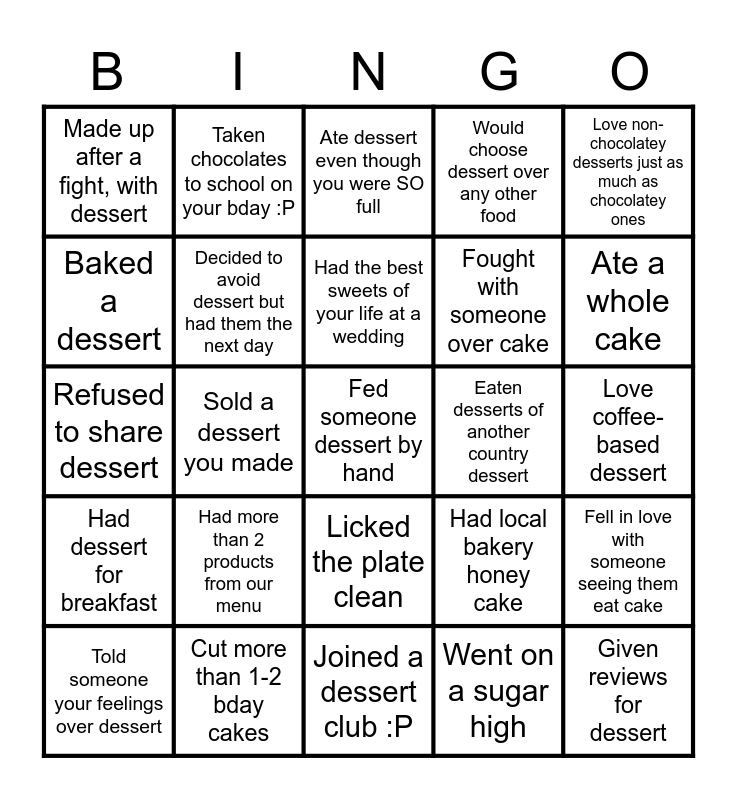 This bingo card has 25 words: Had dessert for breakfast, Cut more than 1-2 bday cakes, Fed someone dessert by hand, Went on a sugar high, Love non-chocolatey desserts just as much as chocolatey ones, Made up after a fight, with dessert, Taken chocolates to school on your bday :P, Ate dessert even though you were SO full, Eaten desserts of another country dessert, Fell in love with someone seeing them eat cake, Baked a dessert, Decided to avoid dessert but had them the next day, Joined a dessert club :P, Had local bakery honey cake, Ate a whole cake, Told someone your feelings over dessert, Sold a dessert you made, Had the best sweets of your life at a wedding, Fought with someone over cake, Love coffee-based dessert, Refused to share dessert, Had more than 2 products from our menu, Licked the plate clean, Would choose dessert over any other food and Given reviews for dessert.