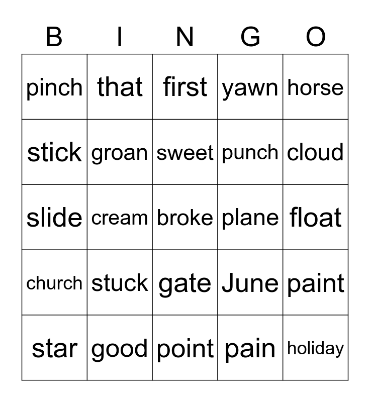 This bingo card has a free space and 24 words: stuck, good, sweet, star, horse, pinch, stick, that, plane, gate, punch, slide, June, paint, groan, pain, float, first, cloud, cream, holiday, church, yawn and point.