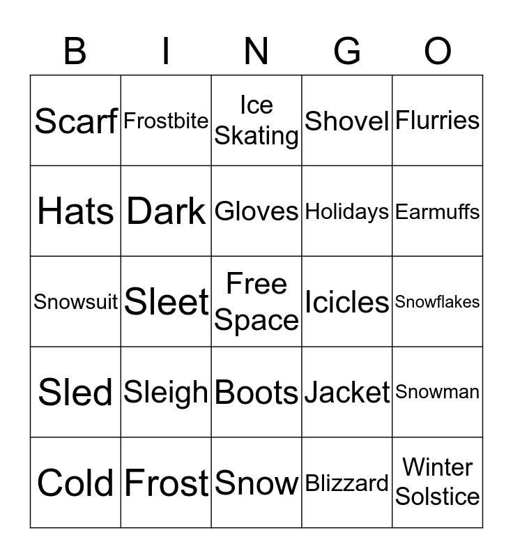 This bingo card has a free space and 24 words: Sleigh, Frost, Gloves, Cold, Flurries, Scarf, Hats, Frostbite, Icicles, Boots, Holidays, Snowsuit, Jacket, Snowman, Dark, Blizzard, Snowflakes, Ice Skating, Earmuffs, Sleet, Winter Solstice, Sled, Shovel and Snow.