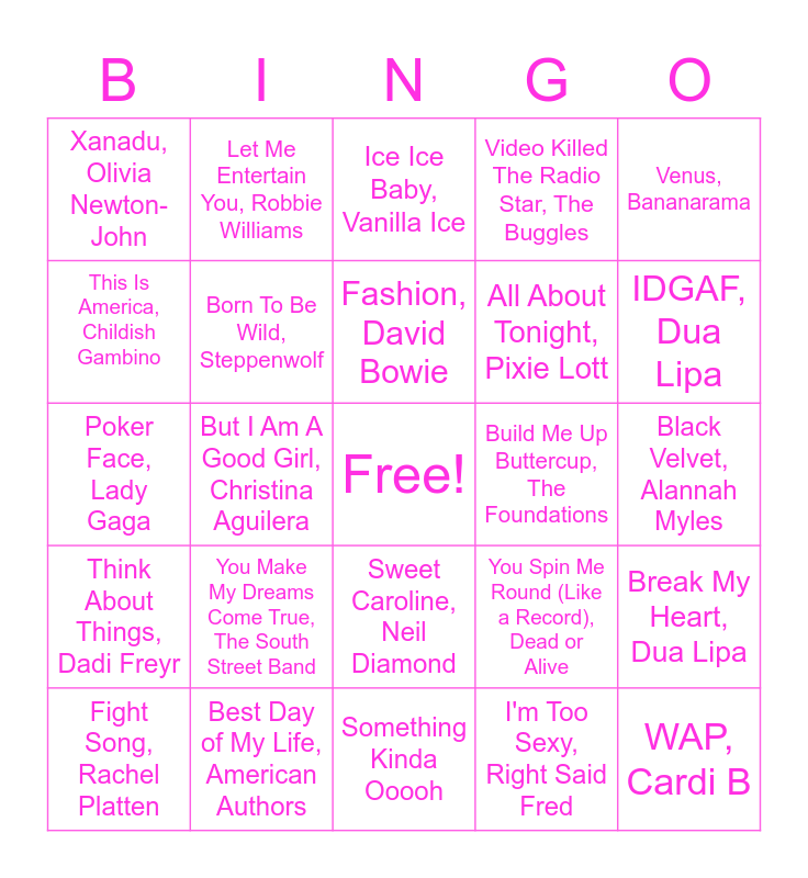 This bingo card has a free space and 44 words: Sweet but Psycho, Ava Max, WAP, Cardi B, Heartbroken, T2, Fight Song, Rachel Platten, Come on Eileen, Dexys Midnight Runners, I'm Too Sexy, Right Said Fred, Ice Ice Baby, Vanilla Ice, 99 Luftballons, Nena, Venus, Bananarama, Best Day of My Life, American Authors, Video Killed The Radio Star, The Buggles, Build Me Up Buttercup, The Foundations, Sweet Caroline, Neil Diamond, You Make My Dreams Come True, The South Street Band, Lady Cowboy, RuPaul, Something Kinda Ooooh, Bad Romance, Lady Gaga, Poker Face, Lady Gaga, Oops!... I Did It Again, Britney Spears, IDGAF, Dua Lipa, Let Me Entertain You, Robbie Williams, Le Freak, CHIC, Brick House, Commodores, Xanadu, Olivia Newton-John, Grace Kelly, MIKA, Black Velvet, Alannah Myles, I Can't Decide, Scissor Sisters, MONTERO (Call Me By Your Name), Lil Nas X, You Spin Me Round (Like a Record), Dead or Alive, Think About Things, Dadi Freyr, Friday I'm In Love, The Cure, Break My Heart, Dua Lipa, Disco Inferno, Tina Turner, Juice, Lizzo, But I Am A Good Girl, Christina Aguilera, Cars, Gary Numan, 2 Times, Ann Lee, Hungry Like the Wolf, Duran Duran, Fashion, David Bowie, This Is America, Childish Gambino, All About Tonight, Pixie Lott, Word Up, Cameo, Born To Be Wild, Steppenwolf and Judas, Lady Gaga.