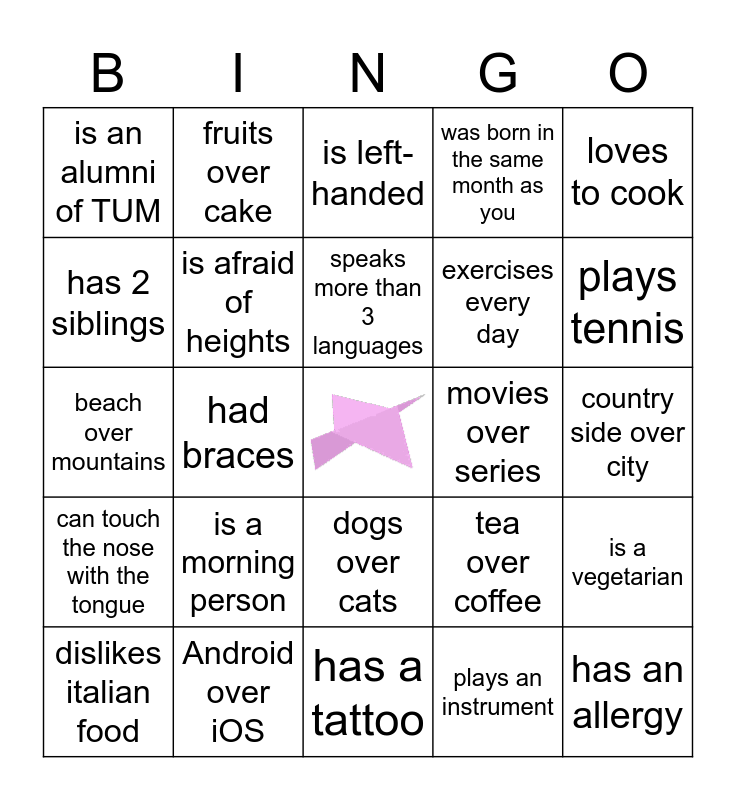 This bingo card has a free space and 24 words: is a morning person, Android over iOS, speaks more than 3 languages, dislikes italian food, loves to cook, is an alumni of TUM, has 2 siblings, fruits over cake, movies over series, dogs over cats, exercises every day, beach over mountains, tea over coffee, is a vegetarian, is afraid of heights, plays an instrument, country side over city, is left-handed, plays tennis, had braces, has an allergy, can touch the nose with the tongue, was born in the same month as you and has a tattoo.