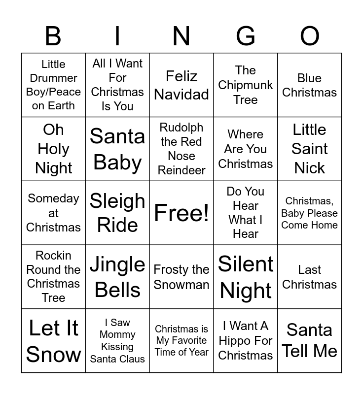 This bingo card has a free space and 24 words: Jingle Bells, I Saw Mommy Kissing Santa Claus, Rudolph the Red Nose Reindeer, Let It Snow, Blue Christmas, Little Drummer Boy/Peace on Earth, Oh Holy Night, All I Want For Christmas Is You, Do You Hear What I Hear, Frosty the Snowman, Where Are You Christmas, Someday at Christmas, Silent Night, Last Christmas, Santa Baby, I Want A Hippo For Christmas, Christmas, Baby Please Come Home, Feliz Navidad, Little Saint Nick, Sleigh Ride, Santa Tell Me, Rockin Round the Christmas Tree, The Chipmunk Tree and Christmas is My Favorite Time of Year.