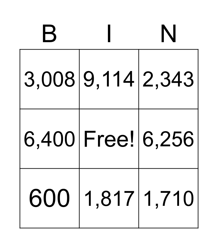 This bingo card has a free space and 8 words: 6,256, 2,343, 9,114, 600, 3,008, 1,710, 6,400 and 1,817.