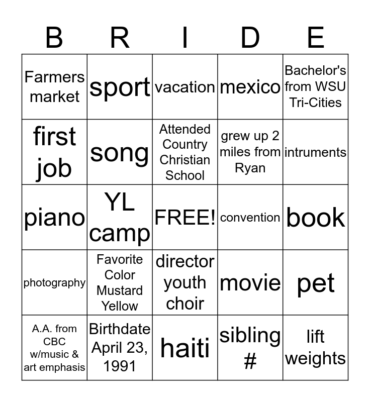 This bingo card has a free space and 24 words: Favorite Color Mustard Yellow, Birthdate April 23, 1991, Attended Country Christian School, A.A. from CBC w/music & art emphasis, Bachelor's from WSU Tri-Cities, Farmers market, first job, sport, convention, director youth choir, grew up 2 miles from Ryan, piano, movie, pet, song, sibling #, book, vacation, intruments, YL camp, lift weights, photography, mexico and haiti.