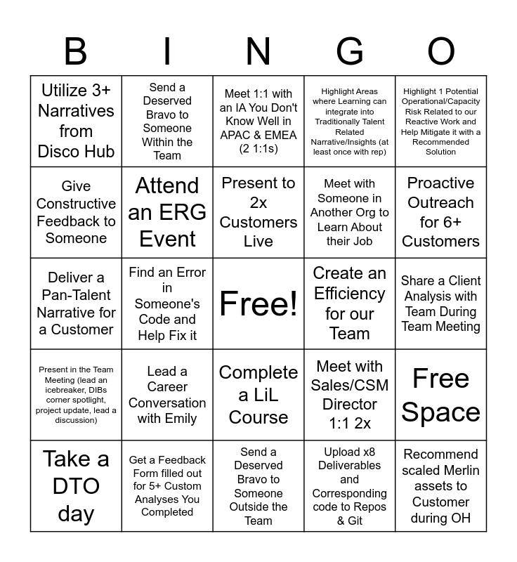 This bingo card has a free space and 25 words: Lead a Career Conversation with Emily, Send a Deserved Bravo to Someone Outside the Team, Present to 2x Customers Live, Take a DTO day, Highlight 1 Potential Operational/Capacity Risk Related to our Reactive Work and Help Mitigate it with a Recommended Solution, Utilize 3+ Narratives from Disco Hub, Give Constructive Feedback to Someone, Send a Deserved Bravo to Someone Within the Team, Create an Efficiency for our Team, Complete a LiL Course, Meet with Someone in Another Org to Learn About their Job, Deliver a Pan-Talent Narrative for a Customer, Meet with Sales/CSM Director 1:1 2x, Free Space, Attend an ERG Event, Be the Hero! Pick up a Last Minute Reactive Request, Share a Client Analysis with Team During Team Meeting, Meet 1:1 with an IA You Don't Know Well in APAC & EMEA (2 1:1s), Proactive Outreach for 6+ Customers, Find an Error in Someone's Code and Help Fix it, Recommend scaled Merlin assets to Customer during OH, Get a Feedback Form filled out for 5+ Custom Analyses You Completed, Present in the Team Meeting (lead an icebreaker, DIBs corner spotlight, project update, lead a discussion), Highlight Areas where Learning can integrate into Traditionally Talent Related Narrative/Insights (at least once with rep) and Upload x8 Deliverables and Corresponding code to Repos & Git.