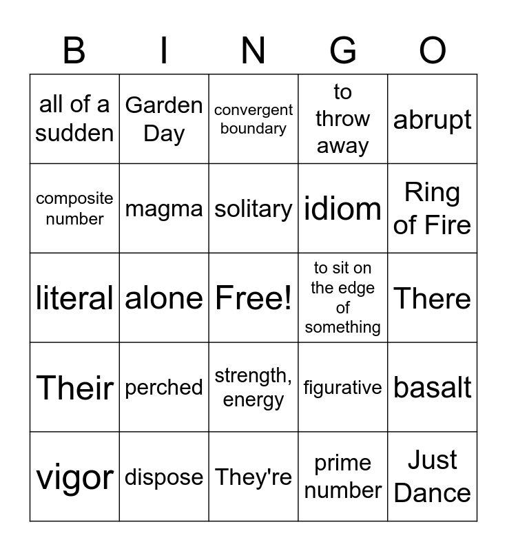 This bingo card has a free space and 24 words: perched, dispose, solitary, vigor, abrupt, all of a sudden, composite number, Garden Day, to sit on the edge of something, strength, energy, idiom, literal, figurative, basalt, magma, prime number, There, convergent boundary, Ring of Fire, alone, Just Dance, Their, to throw away and They're.