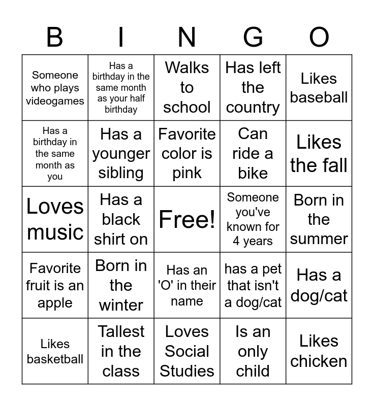 This bingo card has a free space and 24 words: Born in the winter, Tallest in the class, Favorite color is pink, Likes basketball, Likes baseball, Someone who plays videogames, Has a birthday in the same month as you, Has a birthday in the same month as your half birthday, Someone you've known for 4 years, Has an 'O' in their name, Can ride a bike, Loves music, has a pet that isn't a dog/cat, Has a dog/cat, Has a younger sibling, Is an only child, Born in the summer, Walks to school, Likes the fall, Has a black shirt on, Likes chicken, Favorite fruit is an apple, Has left the country and Loves Social Studies.