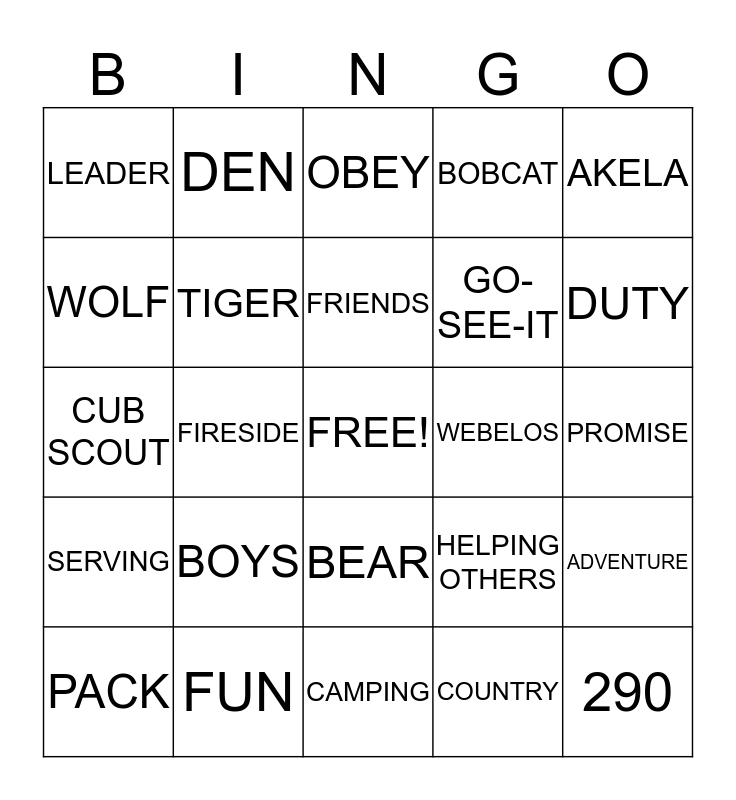 This bingo card has a free space and 24 words: BOYS, FUN, FRIENDS, PACK, AKELA, LEADER, WOLF, DEN, WEBELOS, BEAR, GO-SEE-IT, CUB SCOUT, HELPING OTHERS, ADVENTURE, TIGER, COUNTRY, PROMISE, OBEY, DUTY, FIRESIDE, 290, SERVING, BOBCAT and CAMPING.