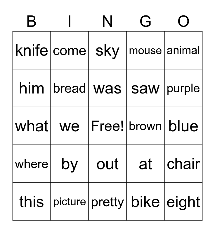 This bingo card has a free space and 24 words: by, picture, was, this, animal, knife, him, come, brown, out, saw, what, at, chair, bread, bike, blue, sky, purple, we, eight, where, mouse and pretty.
