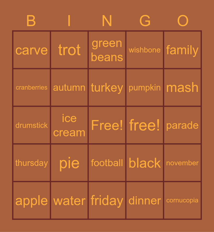 This bingo card has a free space and 24 words: pie, water, turkey, apple, family, carve, cranberries, trot, free!, football, pumpkin, drumstick, black, november, autumn, dinner, parade, green beans, mash, ice cream, cornucopia, thursday, wishbone and friday.