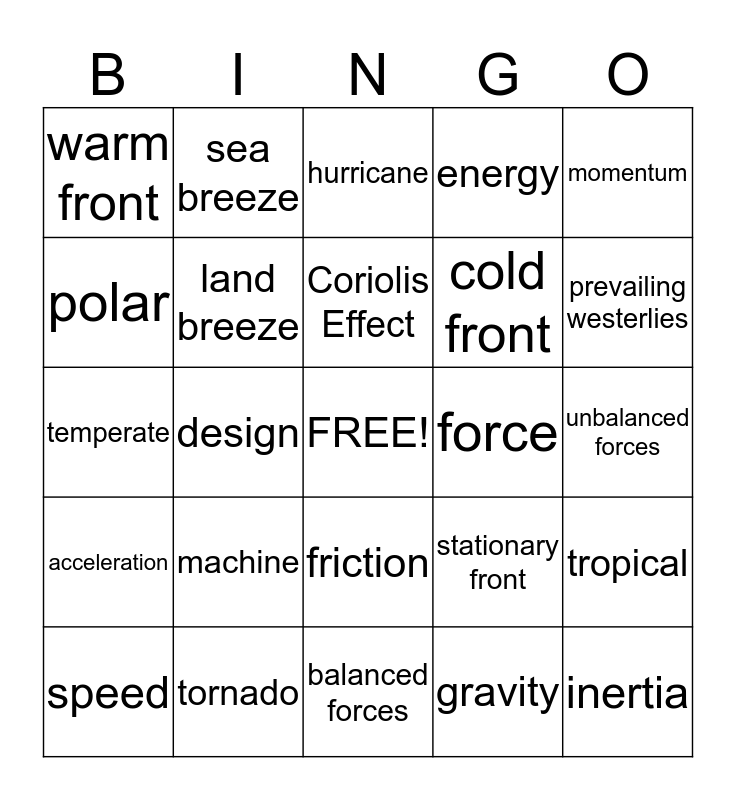 This bingo card has a free space and 24 words: machine, tornado, Coriolis Effect, speed, momentum, warm front, polar, sea breeze, force, friction, cold front, temperate, stationary front, tropical, land breeze, gravity, unbalanced forces, hurricane, prevailing westerlies, design, inertia, acceleration, energy and balanced forces.