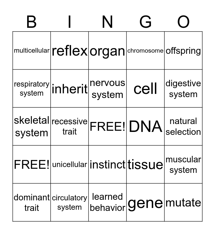 This bingo card has a free space and 24 words: unicellular, circulatory system, nervous system, dominant trait, offspring, multicellular, respiratory system, reflex, DNA, instinct, cell, skeletal system, tissue, muscular system, inherit, gene, natural selection, organ, digestive system, recessive trait, mutate, FREE!, chromosome and learned behavior.