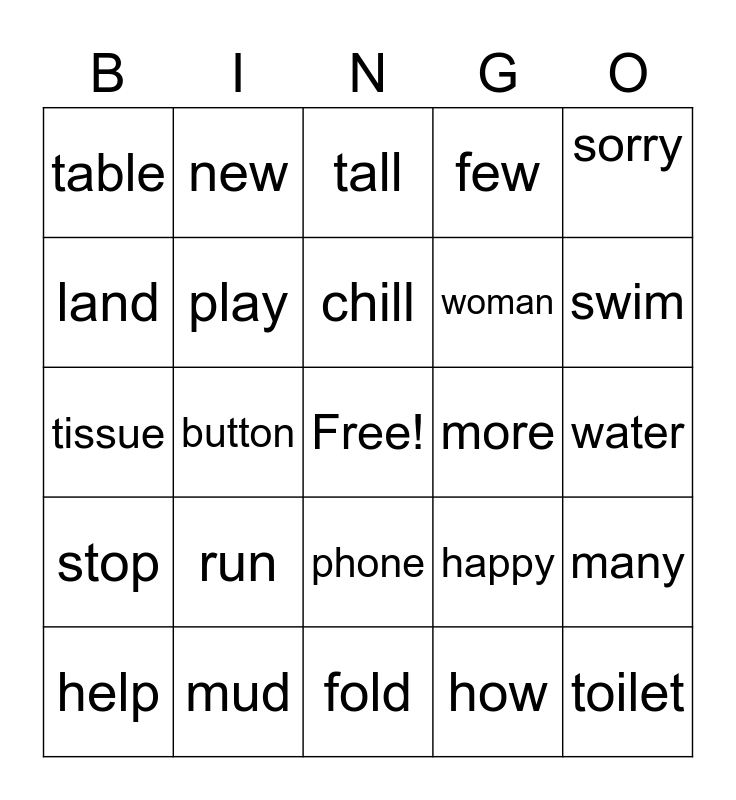 This bingo card has a free space and 24 words: run, mud, chill, help, sorry, table, land, new, more, phone, woman, tissue, happy, many, play, how, water, tall, swim, button, toilet, stop, few and fold.