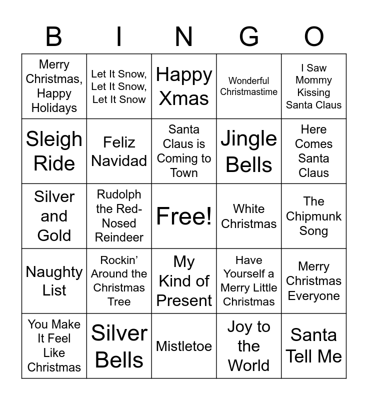 This bingo card has a free space and 48 words: All I Want for Christmas is You, Santa Tell Me, Last Christmas, Mistletoe, Rockin’ Around the Christmas Tree, Jingle Bell Rock, Let It Snow, Let It Snow, Let It Snow, It’s the Most Wonderful Time of the Year, Sleigh Ride, Holly Jolly Christmas, Feliz Navidad, Wonderful Christmastime, Merry Christmas Everyone, Have Yourself a Merry Little Christmas, Baby, It’s Cold Outside, Santa Baby, Santa Claus is Coming to Town, White Christmas, The Christmas Song, I Saw Mommy Kissing Santa Claus, Rudolph the Red-Nosed Reindeer, Joy to the World, Merry Christmas, Happy Holidays, Jingle Bells, Run Rudolph Run, Here Comes Santa Claus, You Make It Feel Like Christmas, Oh Santa!, My Kind of Present, Naughty List, Linus and Lucy, Christmas Time is Here, Carol of the Bells, The Nutcracker Suite, Silver Bells, Blue Christmas, Mele Kalikimaka, The Chipmunk Song, What Christmas Means to Me, Little Saint Nick, Please Come Home for Christmas, (There’s No Place Like) Home for the Holidays, Happy Xmas, Step Into Christmas, Silver and Gold, Grandma Got Run Over by a Reindeer, You’re a Mean One, Mr. Grinch and Do You Hear What I Hear.