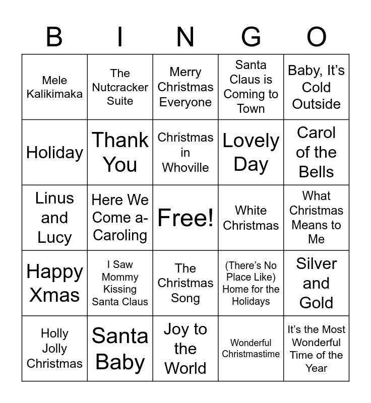 This bingo card has a free space and 45 words: Let It Snow, Let It Snow, Let It Snow, It’s the Most Wonderful Time of the Year, Sleigh Ride, Holly Jolly Christmas, Feliz Navidad, Wonderful Christmastime, Merry Christmas Everyone, Have Yourself a Merry Little Christmas, Baby, It’s Cold Outside, Santa Baby, Santa Claus is Coming to Town, White Christmas, The Christmas Song, I Saw Mommy Kissing Santa Claus, Rudolph the Red-Nosed Reindeer, Joy to the World, Merry Christmas, Happy Holidays, Linus and Lucy, Christmas Time is Here, Carol of the Bells, The Nutcracker Suite, Silver Bells, Blue Christmas, Mele Kalikimaka, The Chipmunk Song, What Christmas Means to Me, Little Saint Nick, Please Come Home for Christmas, (There’s No Place Like) Home for the Holidays, Happy Xmas, Step Into Christmas, Silver and Gold, Grandma Got Run Over by a Reindeer, You’re a Mean One, Mr. Grinch, Do You Hear What I Hear, Here We Come a-Caroling, I Want a Hippopotamus for Christmas, Looks Like a Cold, Cold Winter, Ring Christmas Bells, Christmas in Whoville, Holiday, Lovely Day, We Are Family, Thank You and Happy Holiday.
