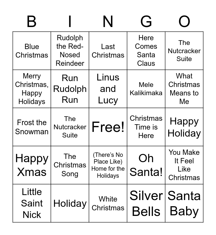 This bingo card has a free space and 49 words: Baby, It’s Cold Outside, Santa Baby, Santa Claus is Coming to Town, White Christmas, The Christmas Song, I Saw Mommy Kissing Santa Claus, Rudolph the Red-Nosed Reindeer, Joy to the World, Merry Christmas, Happy Holidays, Jingle Bells, Run Rudolph Run, Here Comes Santa Claus, You Make It Feel Like Christmas, Oh Santa!, My Kind of Present, Naughty List, Linus and Lucy, Christmas Time is Here, Carol of the Bells, The Nutcracker Suite, The Nutcracker Suite, Silver Bells, Blue Christmas, Mele Kalikimaka, The Chipmunk Song, What Christmas Means to Me, Little Saint Nick, Please Come Home for Christmas, (There’s No Place Like) Home for the Holidays, Happy Xmas, I Want a Hippopotamus for Christmas, Looks Like a Cold, Cold Winter, Ring Christmas Bells, Christmas in Whoville, Holiday, Lovely Day, We Are Family, Thank You, Happy Holiday, This Christmas, Cool Yule, O Tannenbum, Candy Cane Lane, Waltz of the Flowers, Frost the Snowman, Last Christmas, Only Gift, My Favorite Things and Abominable Snowman.
