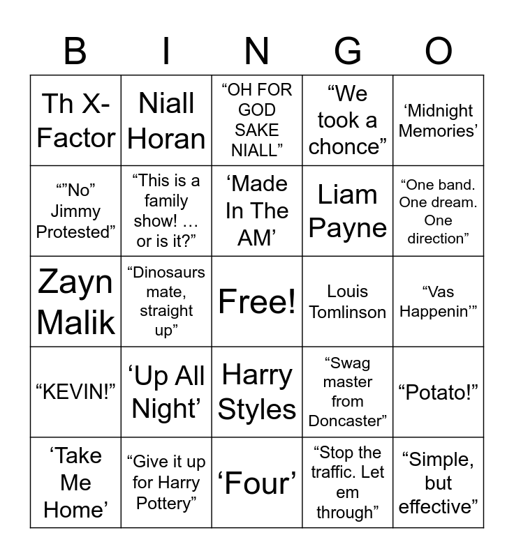 This bingo card has a free space and 25 words: ‘Up All Night’, ‘Four’, ‘Made In The AM’, ‘Take Me Home’, ‘Midnight Memories’, Th X-Factor, “”No” Jimmy Protested”, Niall Horan, Louis Tomlinson, Harry Styles, Liam Payne, Zayn Malik, “Swag master from Doncaster”, “Potato!”, “This is a family show! … or is it?”, “Cute as a button every single one of you”, “Vas Happenin’”, “OH FOR GOD SAKE NIALL”, “One band. One dream. One direction”, “Dinosaurs mate, straight up”, “Simple, but effective”, “Give it up for Harry Pottery”, “KEVIN!”, “We took a chonce” and “Stop the traffic. Let em through”.