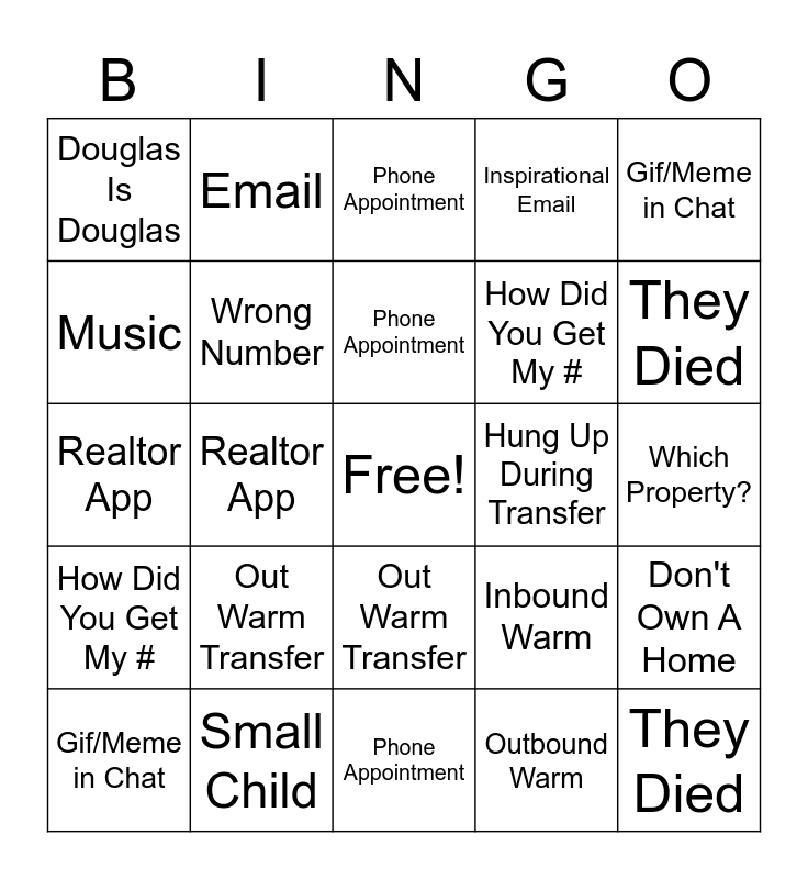 This bingo card has a free space and 50 words: Stop Calling Me!, They Died, Business, Phone Appointment, Out Warm Transfer, Call Back, Email, Realtor App, Music, Small Child, Wrong Number, Inspirational Email, Don't Own A Home, Inbound Warm, Laureen Sends Name, Just Spoke with Us, Phone Appointment, Hung Up During Transfer, Outbound Warm, Gif/Meme in Chat, Realtor App, Outbound Warm, Douglas Is Douglas, How Did You Get My #, Phone Appointment, Stop Calling Me!, They Died, Business, Phone Appointment, Out Warm Transfer, Call Back, Email, Realtor App, Music, Small Child, Wrong Number, Free, Don't Own A Home, Inbound Warm, Which Property?, Just Spoke with Us, Phone Appointment, Hung Up During Transfer, Outbound Warm, Gif/Meme in Chat, Realtor App, Outbound Warm, Just Refinanced, How Did You Get My # and Phone Appointment.